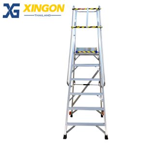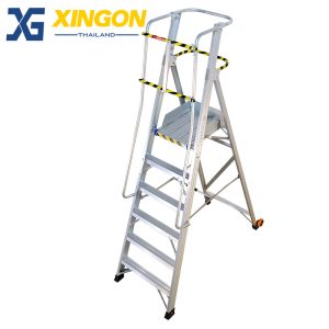 บันไดเซฟตี้อลูมิเนียมติดล้อ มีราวจับ+ราวกันตก บันไดทรงเออลูมิเนียมติดล้อ professional Aluminum platform step ladder with safety gate คุณสมบัติช่วยต้านกระแสไฟฟ้าแรงสูง รับน้ำหนักได้ 150 กก. ออกแบบมาเพื่อใช้ในโรงงานอุตสาหกรรม คลังสินค้า โกดัง มีความแข็งแรง ทนทาน ปลอดภัย ขั้นเหยียบเป็นอลูมิเนียมหนา 2 มม. กันลื่นได้ดี ล้อ PU4″ จำนวน2ล้อ สำหรับเคลื่อนย้าย บันไดพับเก็บได้ ขั้นเหยียบเสริมรอนกันลื่น ช่วยเพิ่มความแข็งแรงและความปลอดภัยขณะใช้งาน มีราวจับทั้ง 2 ด้าน และราวกันตก 3 ด้าน