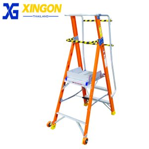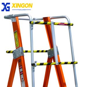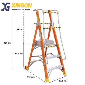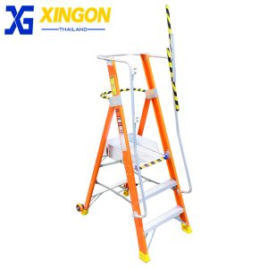 บันไดเซฟตี้ไฟเบอร์กลาสติดล้อ มีราวจับ+ราวกันตก บันไดทรงเอไฟเบอร์กลาสติดล้อ professional fiberglass platform step ladder with safety gate คุณสมบัติช่วยต้านกระแสไฟฟ้าแรงสูง รับน้ำหนักได้ 150 กก. ออกแบบมาเพื่อใช้ในโรงงานอุตสาหกรรม คลังสินค้า โกดัง มีความแข็งแรง ทนทาน ปลอดภัย ขั้นเหยียบเป็นอลูมิเนียมหนา 2 มม.โครงไฟเบอร์กลาสหนา 3 มม. กันลื่นได้ดี ล้อ PU4″ จำนวน2ล้อ สำหรับเคลื่อนย้าย บันไดพับเก็บได้ ขั้นเหยียบเสริมรอนกันลื่น ช่วยเพิ่มความแข็งแรงและความปลอดภัยขณะใช้งาน มีราวจับทั้ง 2 ด้าน และราวกันตก 4 ด้าน