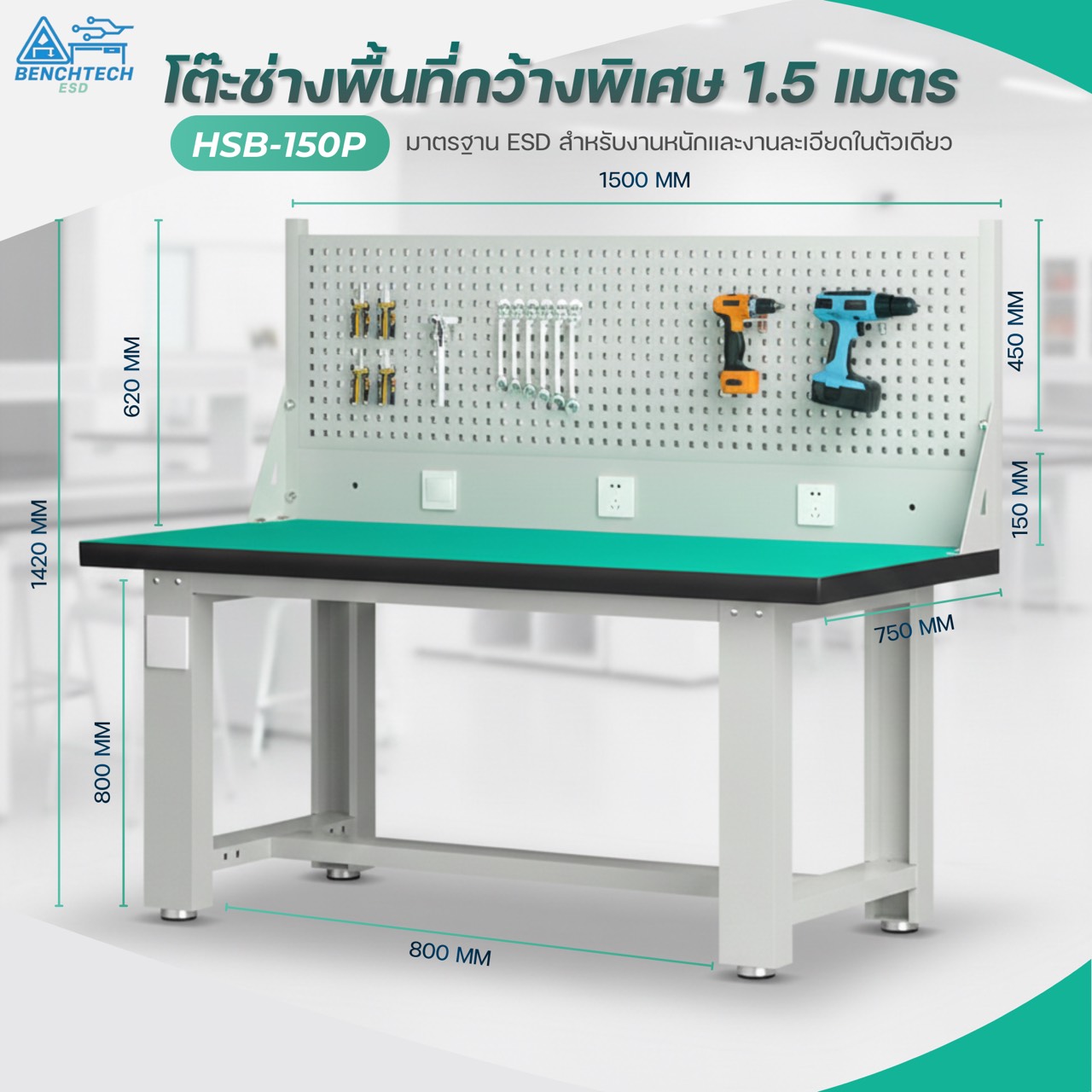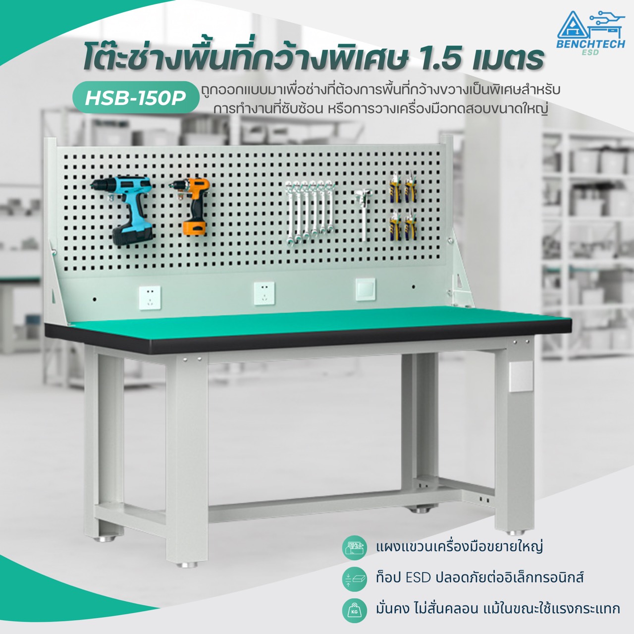 โต๊ะทำงานช่างESDมีแผงแขวนเครื่องมือ 150x75x80 CM.รับน้ำหนักได้1000กก. HSB-150P